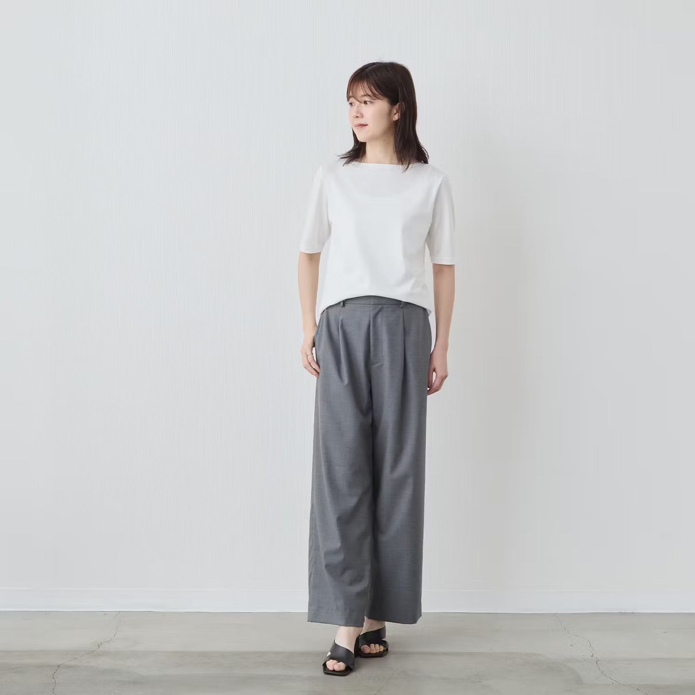 袖丈が長めのTシャツは、カジュアルな印象のドロップショルダーが多い中で、この一枚は“きちんと”を意識。