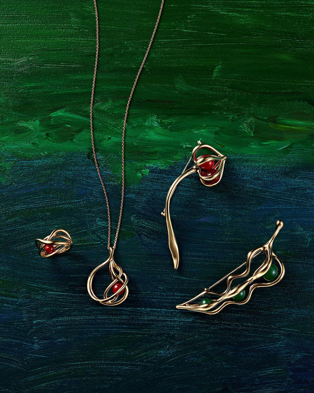 朱赤の天然石カーネリアンが揺れ動く、ほおずきをイメージしたブローチと、グリーン・カルセドニーで豆を表現したブローチは、1991年に「YAMADA PARIS」の名でパリの直営店と日本で販売されたモデルをアップデートしたシリーズ。