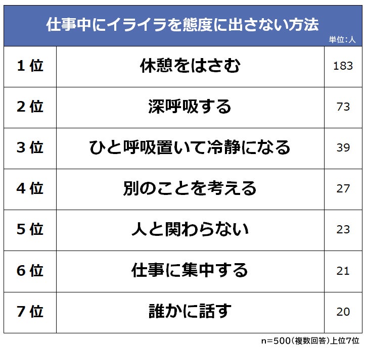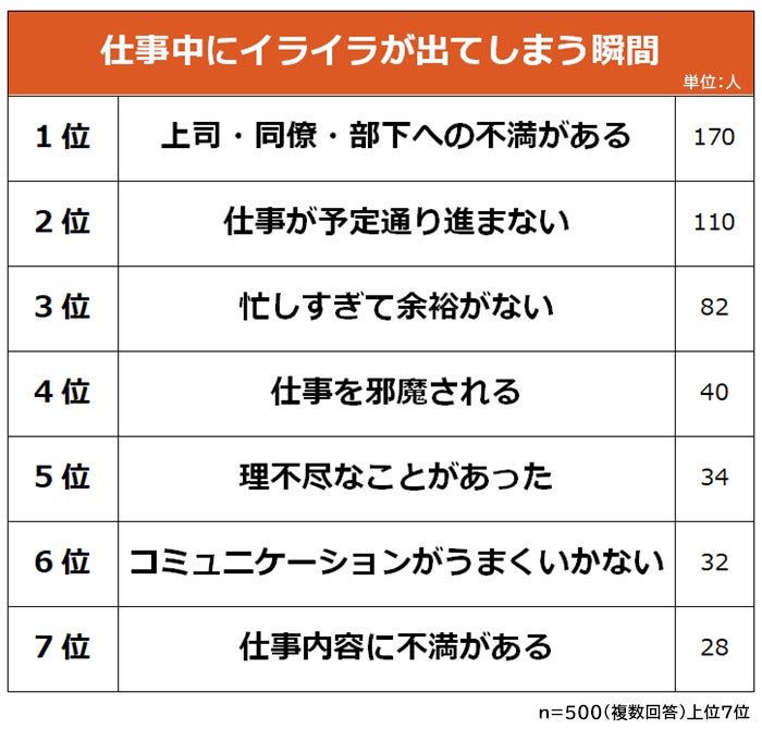 【仕事中にイライラが態度に出てしまう瞬間と出さないための方法ランキング】男女500人アンケート調査