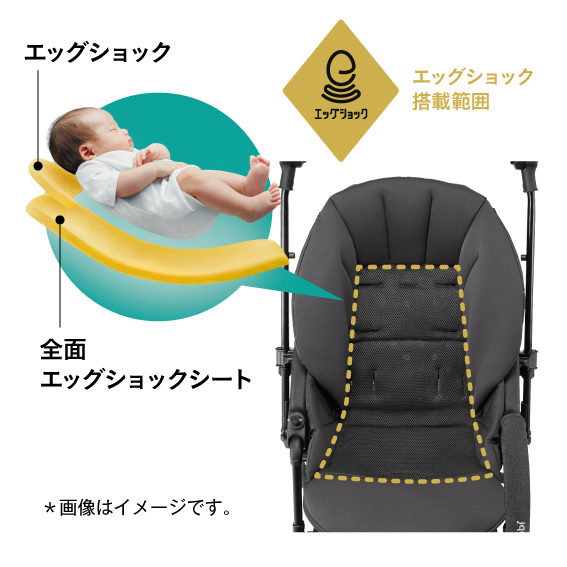 特 徴:軽量車体ながら、赤ちゃんに伝わる路面からの不規則な揺れを軽減するために、卵を落としても割れないほどの超・衝撃吸収素材「エッグショック」をシート全面と、頭部には枕状で搭載し、赤ちゃんの乗り心地にこだわりました。はやぶさのエクステリアデザインを象徴する「ときわグリーン」と「飛雲ホワイト」そして「つつじピンク」の帯を表現した大型幌は、夏の強い日差しから赤ちゃんのデリケートなお肌を守ります。背面間口には、伸縮するネットがついたマルチネットバスケットを搭載し、お買い物の購入品など、荷物をたっぷりと収納できる仕様で、ママ・パパをはじめとする利用者の使い勝手の良さにもこだわりました。