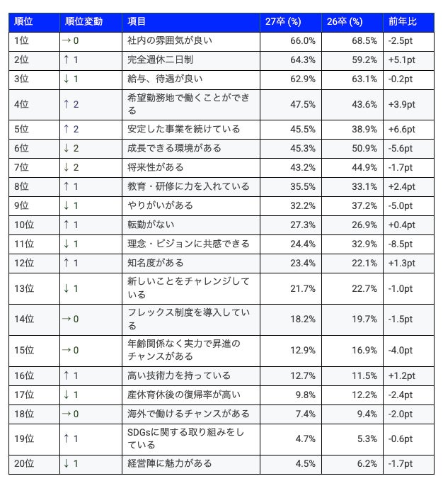 前年(26卒)との比較で見ると、「完全週休二日制(+5.1pt)」や「安定した事業(+6.6pt)」がポイントが増加。一方で、「理念・ビジョン(-8.5pt)」や「成長できる環境(-5.6pt)」は減少しました。
