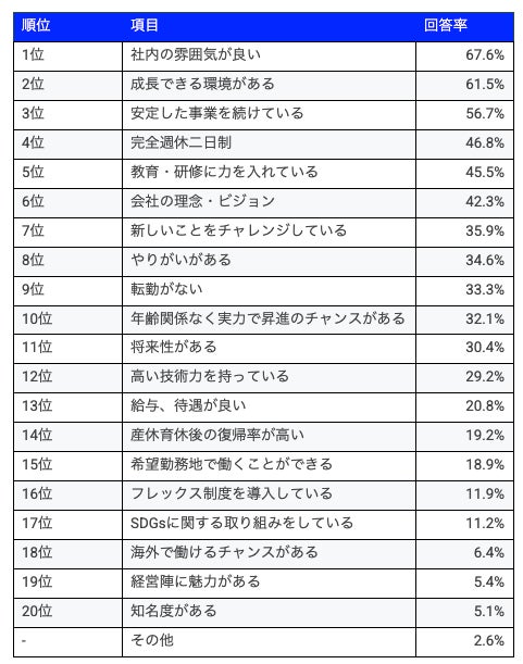 学生が魅力に感じるトップ3は「社内の雰囲気が良い」「完全週休二日制」「給与、待遇が良い」
