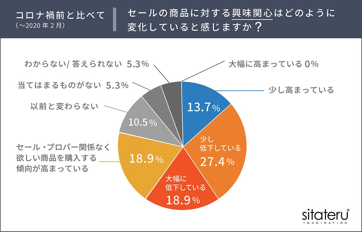 最初の設問で「セールはしていない」と回答した方以外に「Q.コロナ禍前(〜2020年2月)と比べて消費者のセールに対する興味関心はどのように変化していると感じますか。」(n=95)と質問したところ、「少し低下している」27.4%、「大幅に低下している」18.9%という回答でした。