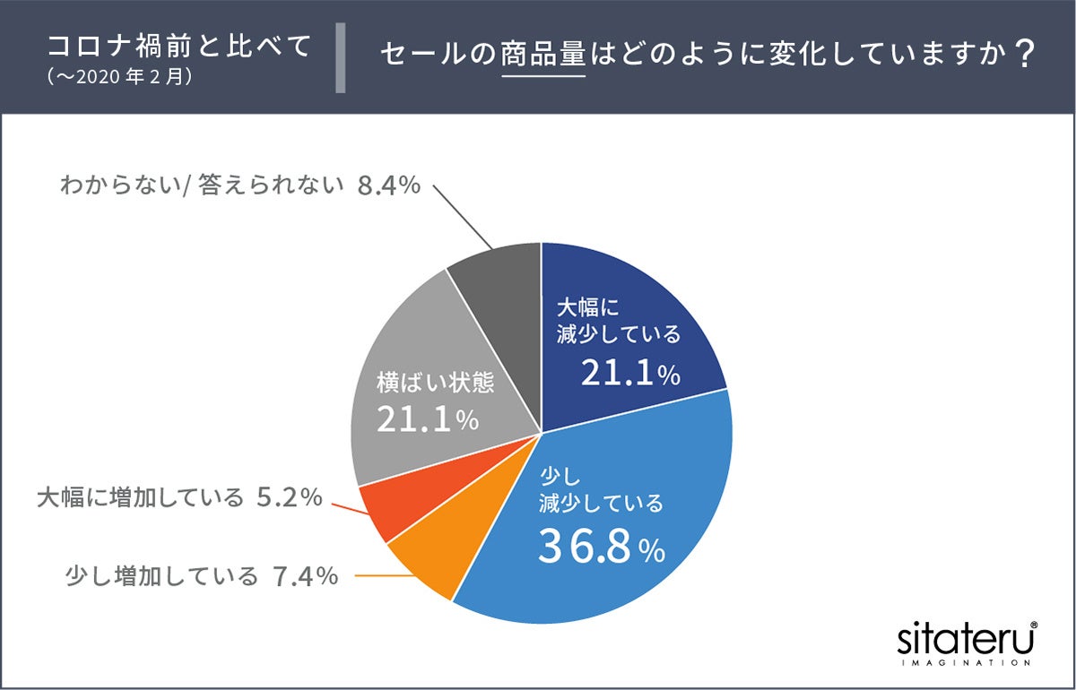 前問で「セールはしていない」と回答した方以外に「Q.コロナ禍前(〜2020年2月)と比べてセールの商品量は変化していますか。」(n=95)と質問しました。「大幅に減少している」は21.1%、「少し減少している」は36.8%、という結果になり、商品量が減少していると回答したのは約6割でした。