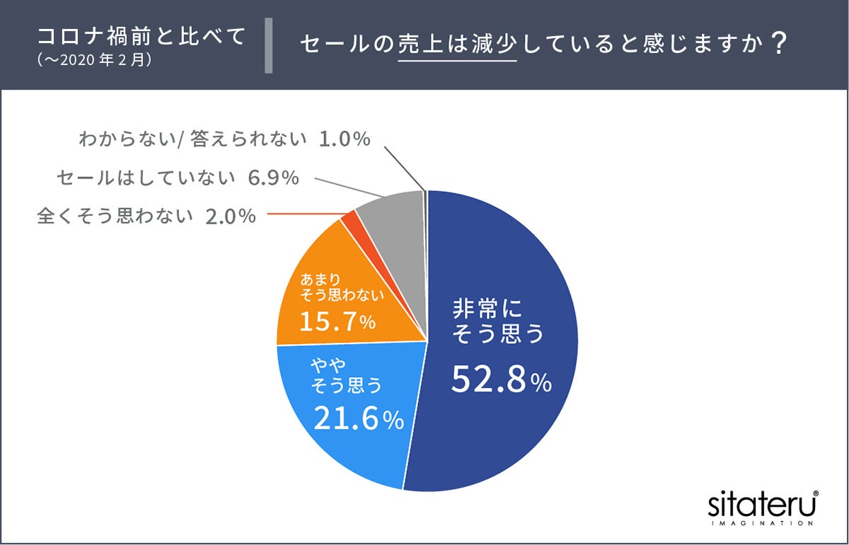 1. コロナ禍前(〜2020年2月)と比べて、7割以上がセールの売上減少を実感。