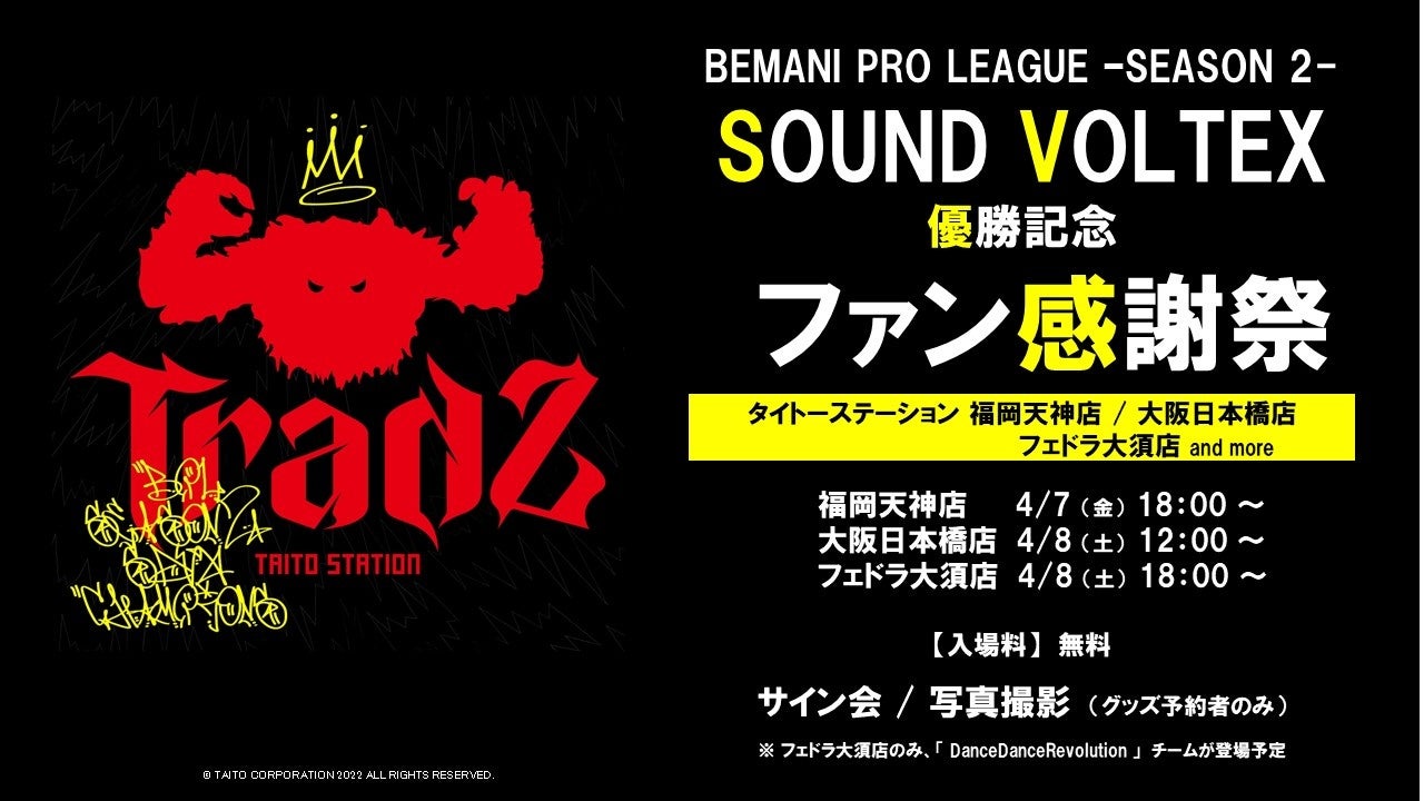 TAITO STATION Tradz -SOUND VOLTEX-の選手たちが、BPLS2優勝記念のファンイベントをタイトーステーションにて開催いたします。