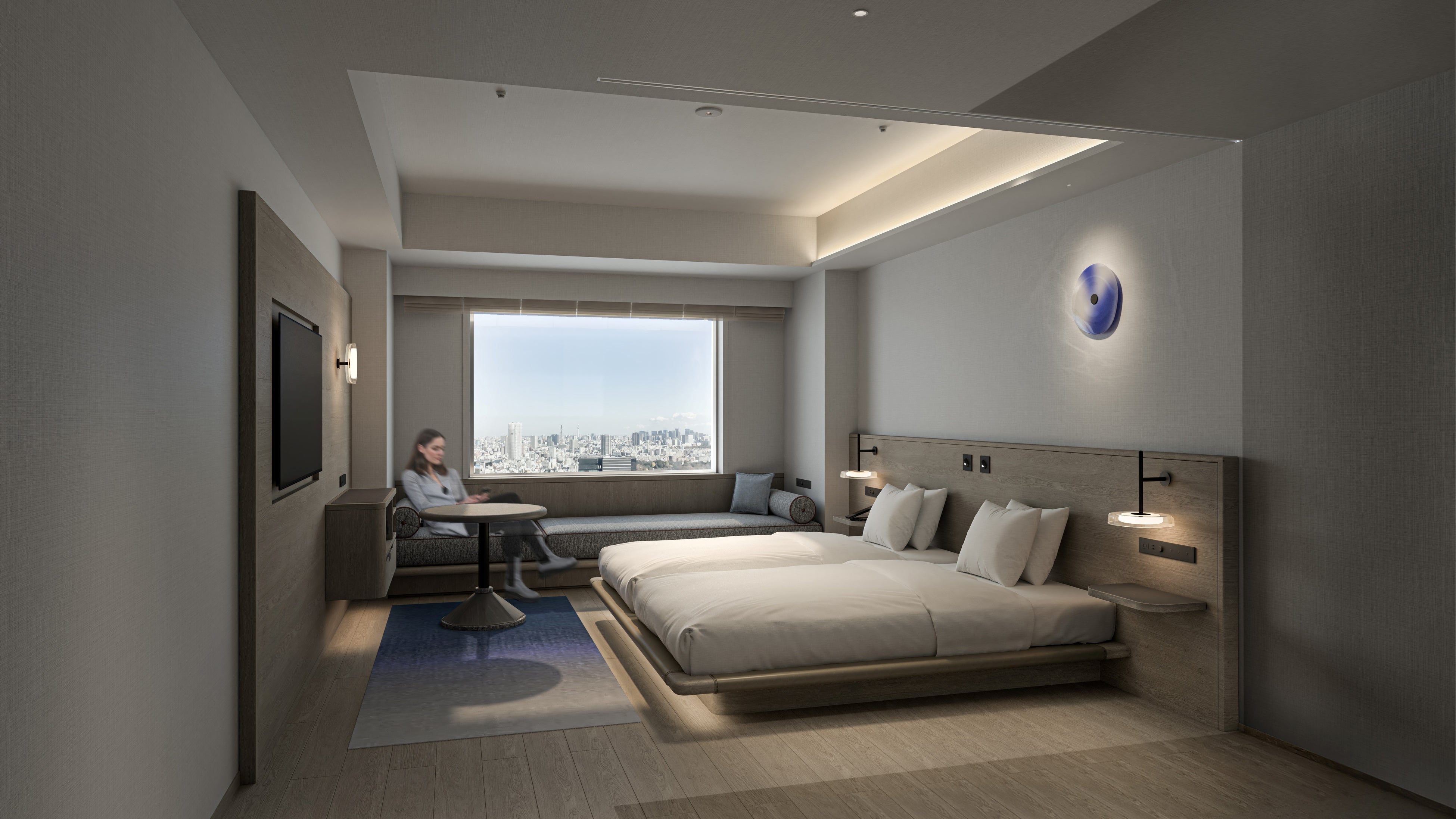 客室は、都会的で洗練されたシンプルなデザインとし、荷物の多いインバウンドのお客さまに不可欠なゆとりのあるスペースを確保するため、置き型の家具を最小限に留める一方で、自慢の眺望を最大限お楽しみいただくためのソファの配置等にこだわります。バスルームも一新し、トイレ・洗面を独立させることで、複数名利用時の利便性を向上させます。窓は遮熱・断熱性能を強化するほか、天井には空気清浄機を組み込むなど、さまざまな面から快適性を高めます。また、どなたでも安全・安心に滞在できる環境を整えるため、段差の少ないアクセシブルルームを4室新設します。