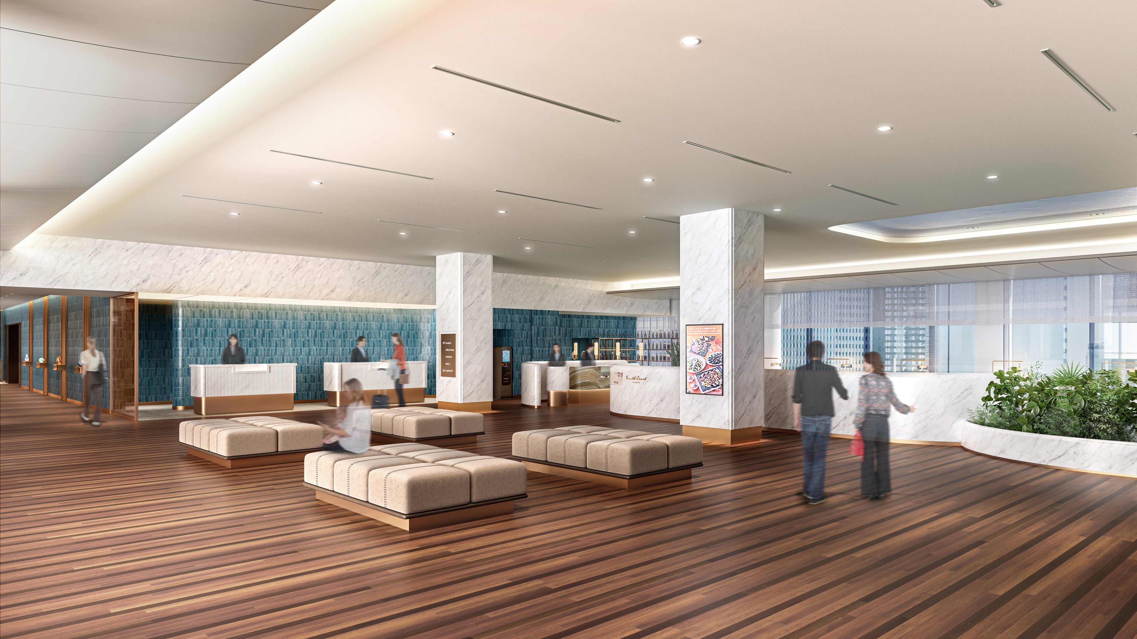 フロント・ロビーでは、スーツケースなど手荷物を収容するバックヤードを拡張して混雑を緩和し、チェックイン等の手続きをよりスピーディーにします。隣接するラウンジは、客席スペースを拡大することで座席数を増やし、夕景などの眺望をより多くのお客さまにお楽しみいただける空間とします。レストランについては、従前からの眺望とオープンキッチンはそのままに、客席レイアウトの刷新により幅広い利用ニーズにお応えするとともに、入口の解放感を高めることで、より気軽に立ち寄りたくなる空間へと進化します。