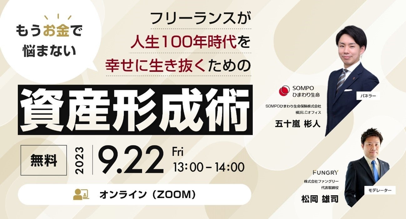 また今回の業務提携に伴い、SOMPOひまわり生命保険の五十嵐彬人氏をパネラーとしてお招きし、フリーランス向けのオンラインセミナー「~もうお金で悩まない!~フリーランスが人生100年時代を幸せに生き抜くための資産形成術」を9月22日(金)に開催する運びとなりましたのでお知らせします。