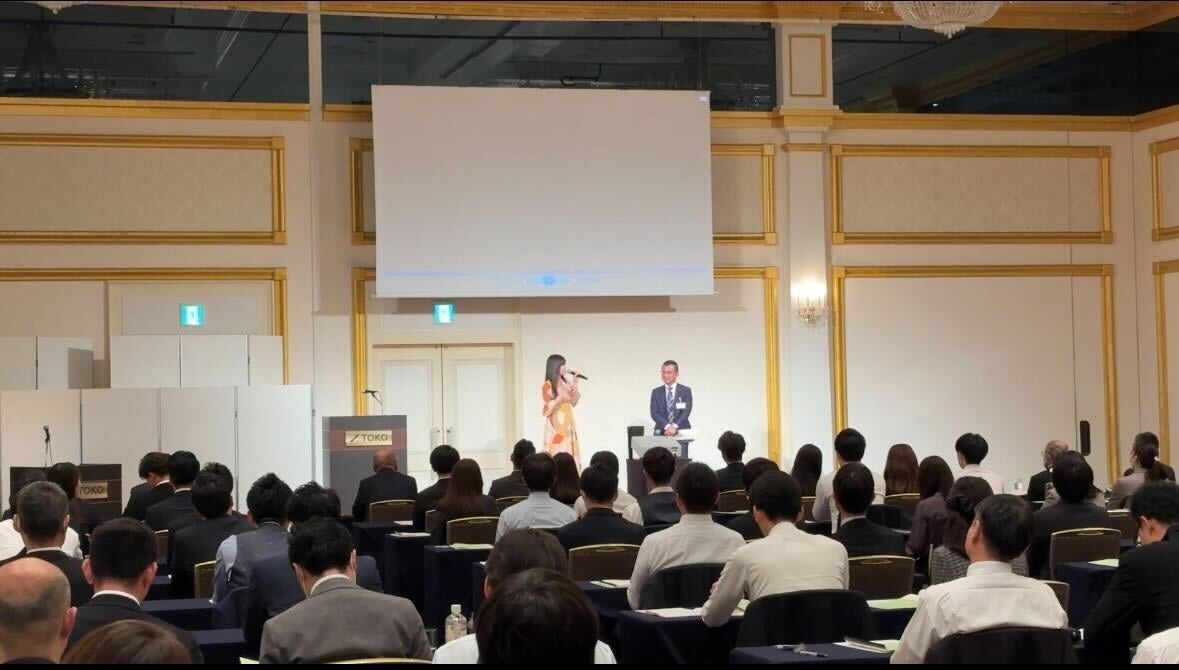 完成したオリジナルソングは100名を超える社員が出席した株式会社トーコーの事業発表会にて初披露されました。その存在を事前に知っていたのは社内でもごく一部に限られており、多くの参加者にとっては完全なサプライズ。そんな中、ボーカリストの希来ひまりさんがステージに登場し、生歌によるパフォーマンスを開始すると、会場はたちまち驚きと期待に包まれました。突然の展開に最初は戸惑う様子も見られましたが、歌が進むにつれて次第に引き込まれていき、曲の終わりには自然と大きな拍手が巻き起こりました。