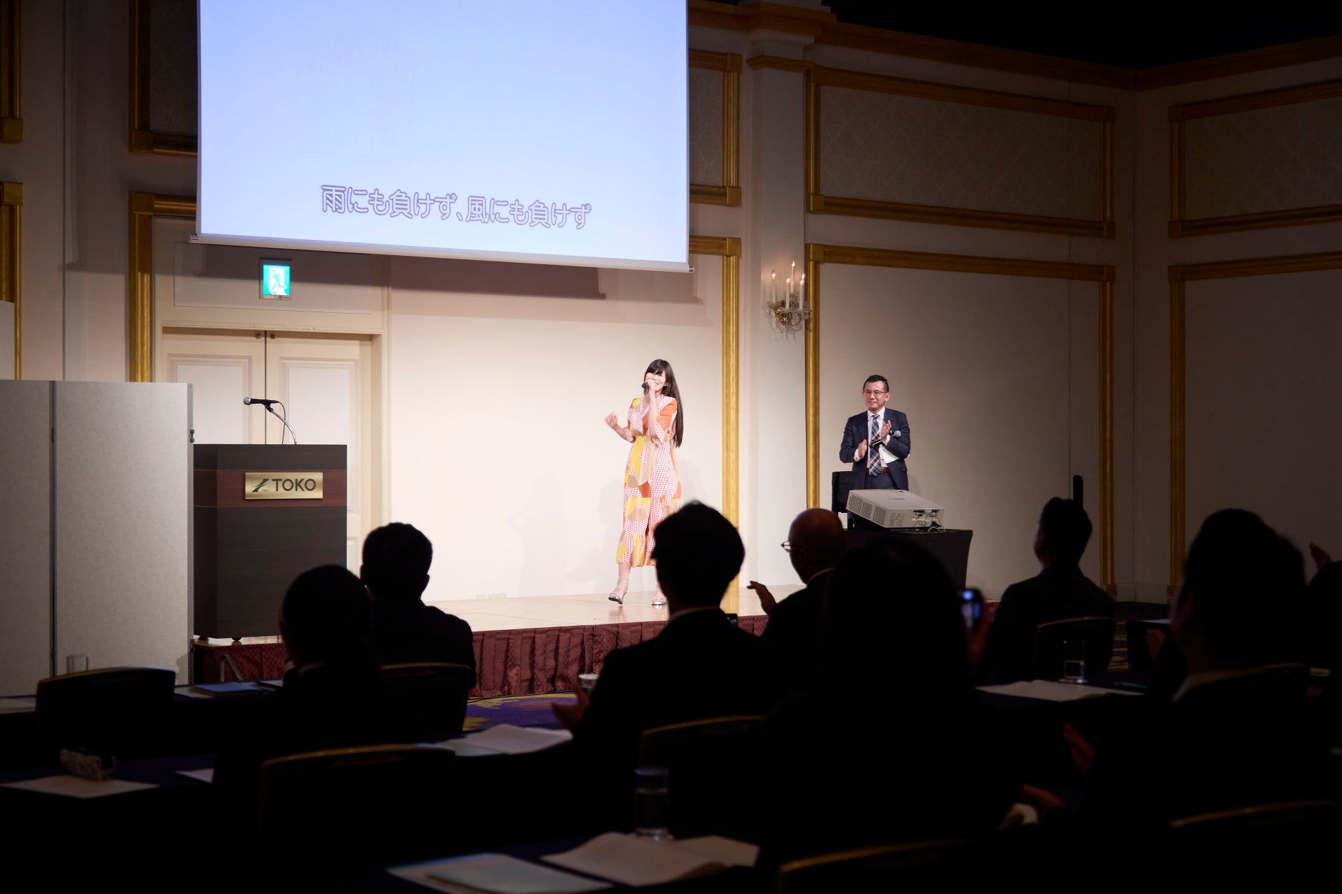 事業発表会で100名以上の社員の前でサプライズ生披露、会場に大きな拍手が響く。