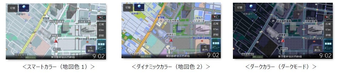道路など情報の優先順位を明確に認識できるよう、色味や彩度を徹底的に調整し、文字色と背景色の重複を避けて配色するとともにコントラストも最適化した地図色「スマートカラー」を搭載。地図の見やすさにこだわって開発したスマートな地図描画が快適なドライブをサポートします。また、従来のカラーも搭載しており、3種類の中から好みの地図色を選べます。