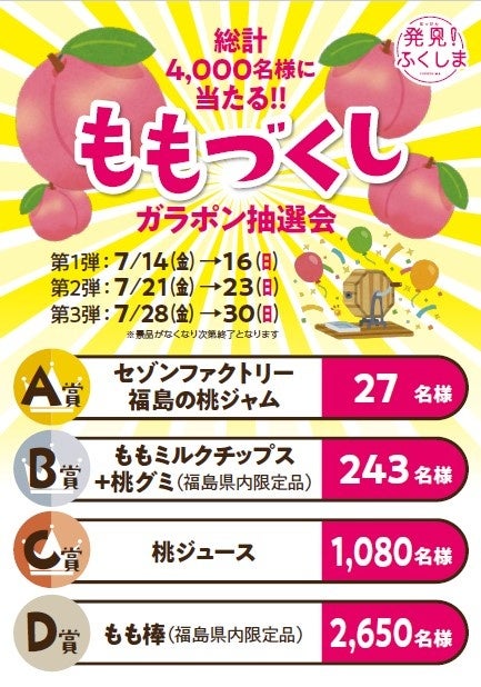 ささやかですが、ふくしまの「ちょいワル桃」を500円(税込)以上お買い上げいただいた方に、楽しいガラポン抽選会を実施いたします。景品もなんと、ももづくし!