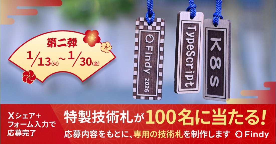 本キャンペーン期間中、ポップアップ内のXポストボタンより「#Findyエンジニアおみくじ2026」のハッシュタグを付けてXに投稿し、所定のフォームにご回答いただいた方の中から、抽選で100名様に「Findy技術札」をプレゼントいたします。 |