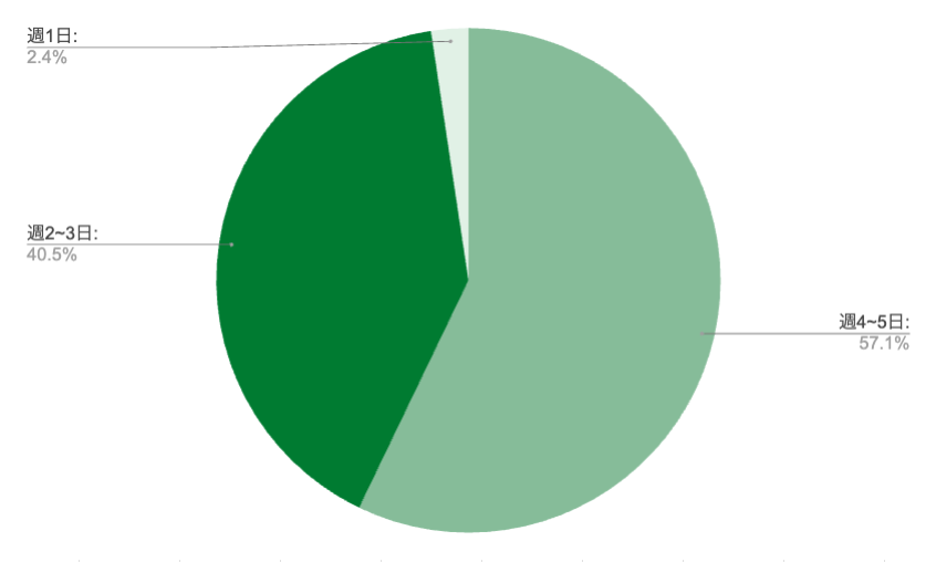 週4~5日が57.1%と過半数を占める一方で、週2~3日も40.5%と高い割合です。WordPress案件はサイト構築やカスタマイズなどプロジェクト単位で進むことが多く、フルタイムでの参画から柔軟な稼働まで幅広い働き方が選べます。週1日はわずか2.4%と少なく、ある程度まとまった稼働が求められる傾向にあります。フルタイムでしっかり稼ぎたい人から、複数案件を掛け持ちしたい人まで、WordPress開発者として多様なキャリアスタイルを実現できる職種です。