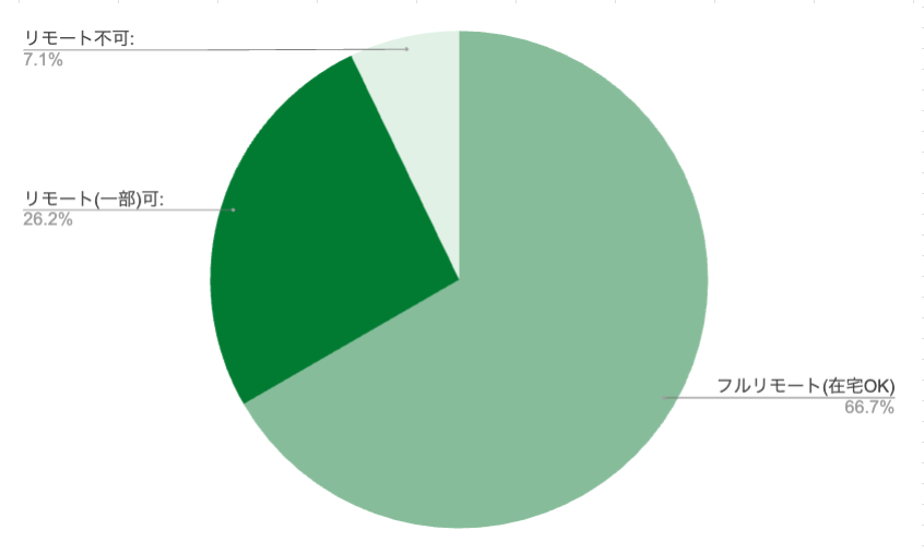 フルリモートが66.7%と高く、リモート一部可を合わせると92.9%がリモート対応可能です。WordPressの開発業務は、開発環境さえあればどこでも作業が可能で、リモートとの相性が非常に良い職種です。クライアントとの打ち合わせや要件確認など、対面が必要な場面もありますが、全体としてはオンラインで完結するケースが多い状況です。リモート不可は7.1%と少なく、全国どこからでもWordPress案件に参画できる柔軟性の高い職種といえます。