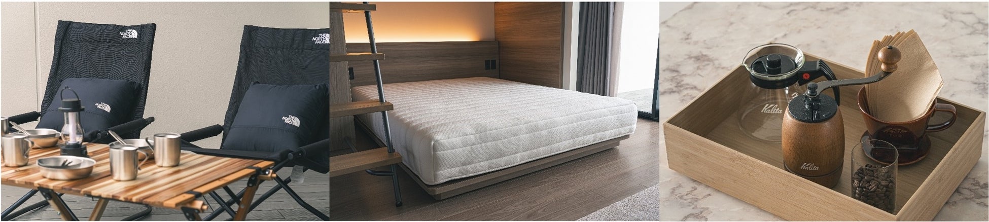 コンセプトルームには、より快適な睡眠をサポートする「ニュートラルワークス.」のマットレスをはじめ、テラスにはアウトドアブランド「THE NORTH FACE」のテーブルやチェア、クーラーボックスが設置され、客室のテラスで海に沈む夕陽を眺めながらBBQをお楽しみいただけます。また、様々なブランドから厳選したマッサージガンやリカバリーサンダル、CBDバスソルト等のコンディショニンググッズも完備しています。