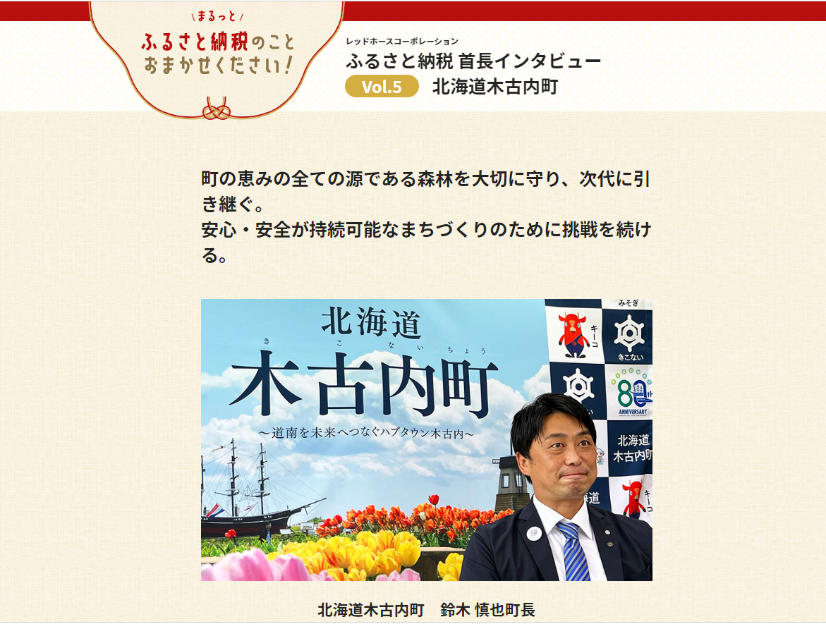 今回、さらなるサポートの一環として9月6日、当社のふるさと納税支援事業の契約先である全国各地の市区町村の首長に話を聞く「RHCふるさと納税首長インタビュー」シリーズ第5弾として木古内町の鈴木 慎也町長のインタビューを公開しました。新たに登場した戦略的返礼品等も含め、町にかける思いを熱く語っていただきました。