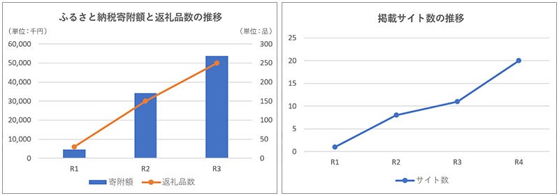 - 取組開始時(平成27年度)はふるさと納税サイトへの掲載がわずか1サイト。当社の自動連携システムにより8年間で10サイトに拡大し、寄附額も右肩上がり。