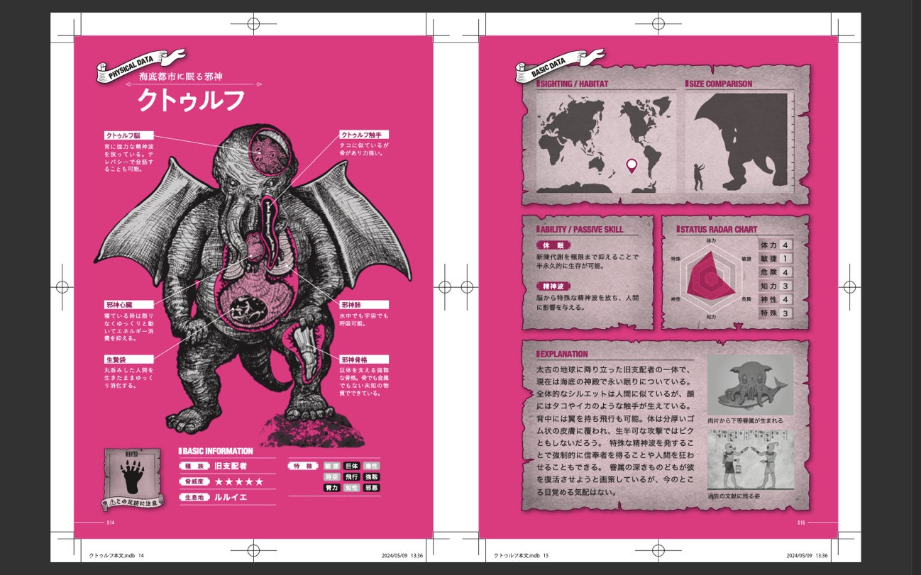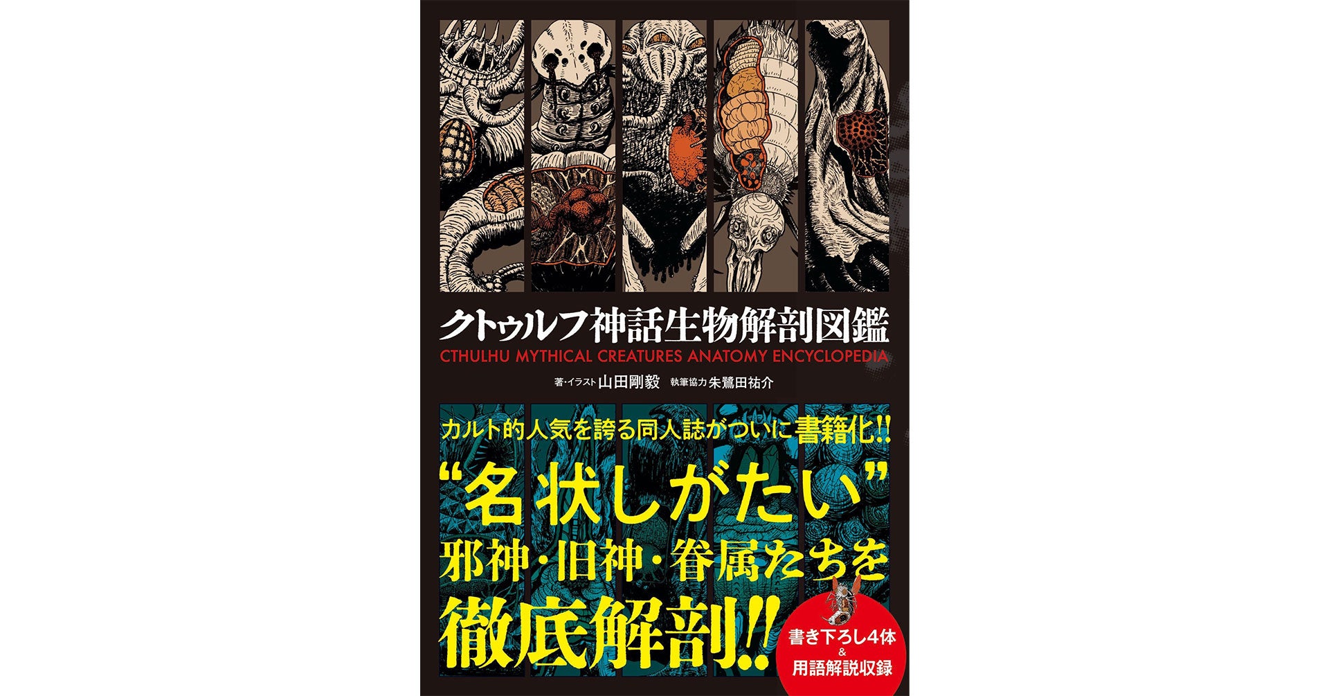 本書は、2023年夏に発売された同人誌『帰ってきた!クトゥルフ神話生物図解』をよりパワーアップさせたものです。同人誌版の解剖図鑑に、新規書き下ろし生物4体、目撃・生息地MAP、朱鷺田祐介氏による用語解説集が加わりさらに楽しめるようになりました。