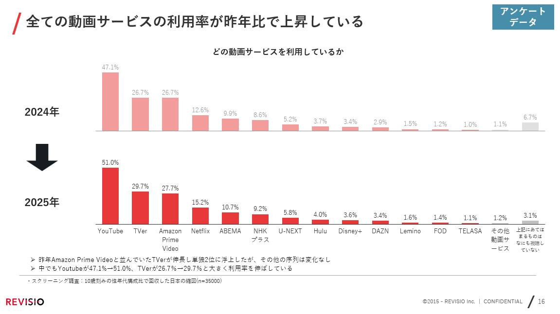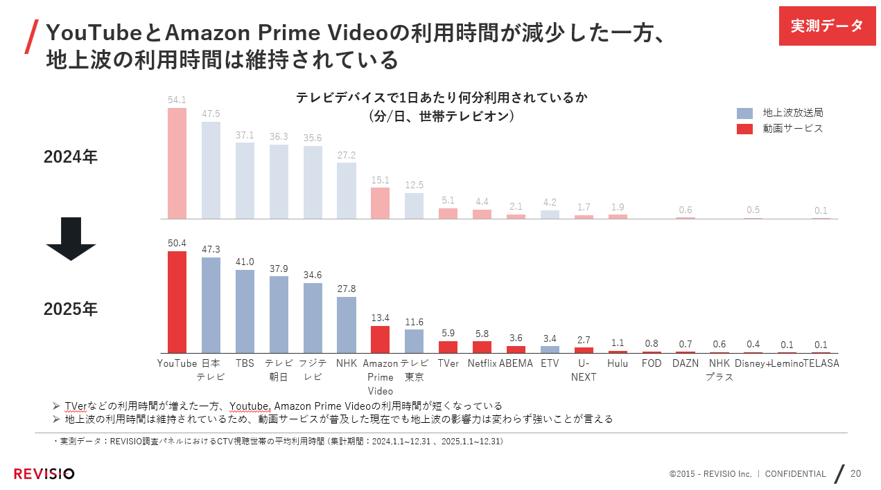 地上波放送局も含めた平均利用時間は2年連続でYouTubeが1位に。全ての動画サービスの利用率は上昇している一方、テレビでの利用時間は動画サービスごとに増減がある