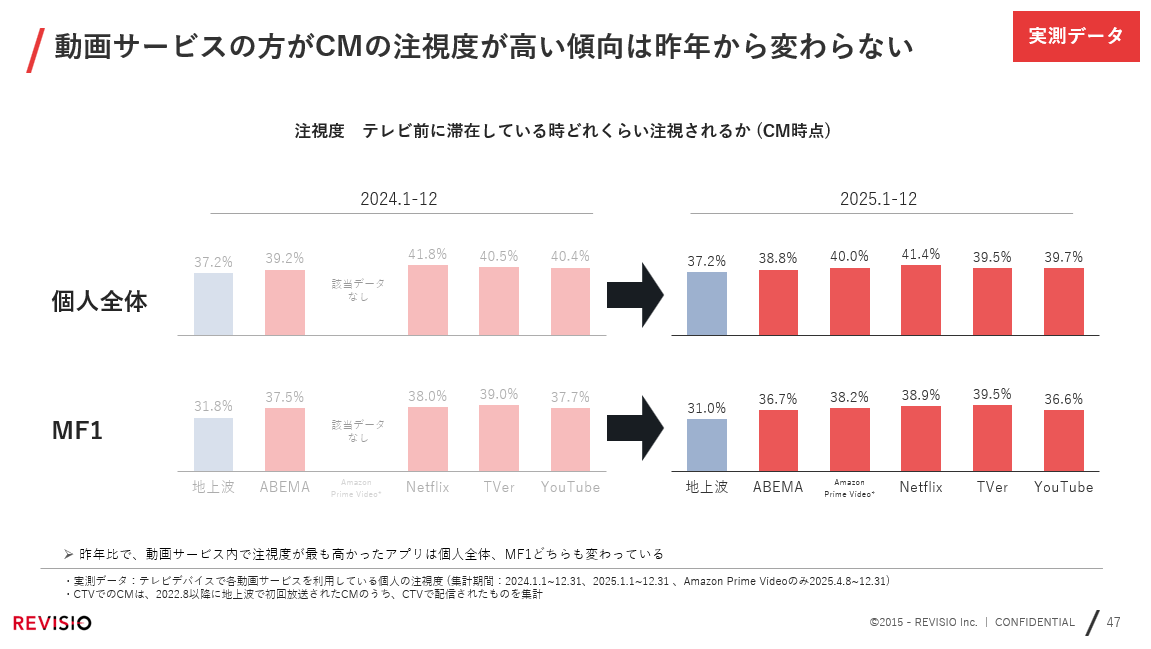 CM時点においても同様で、視聴者が自らコンテンツを選択して視聴していることに加え、CMポジションの良さやCMチャンス(広告時間)が短いことなどが、高いアテンションを維持する要因と考えられる。