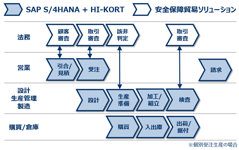 コベルコシステムの製造業向けにSAP S/4HANAをカスタマイズしたERPテンプレート「HI-KORT」と、企業の輸出管理業務を支援する日立ソリューションズの「安全保障貿易管理ソリューション」を連携し、製造業の標準業務フローにおいて、安全保障貿易に関する審査・判定業務をシームレスに連携し、提供することをめざします。