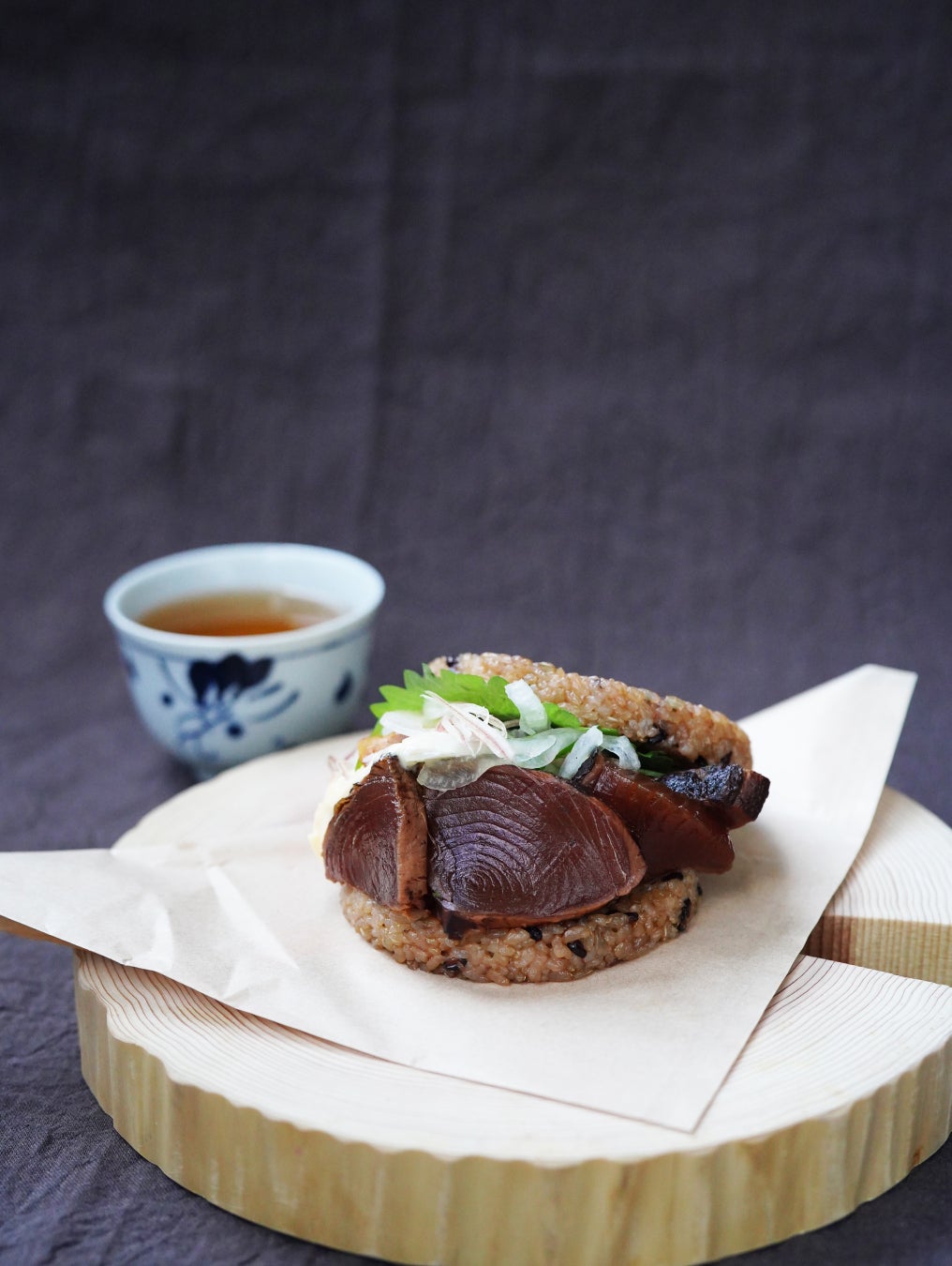 商品名:カツオのタタキ漬けライスバーガー(碁石茶付き)