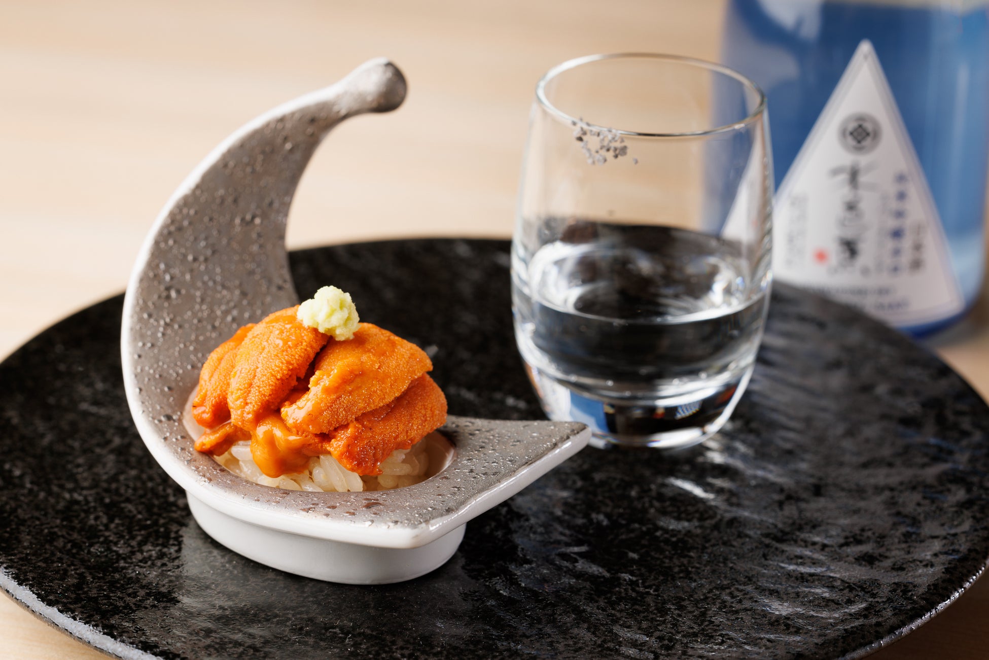 こちらの店舗では上述のおまかせコースをベースとしつつ、日本酒の専門家である日本酒版ソムリエ、SAKE DIPLOMAの資格を保有したスタッフセレクトによる全国から厳選した日本酒と鮨の極上ペアリングが楽しめる「SAKEペアリングコース」もご用意。