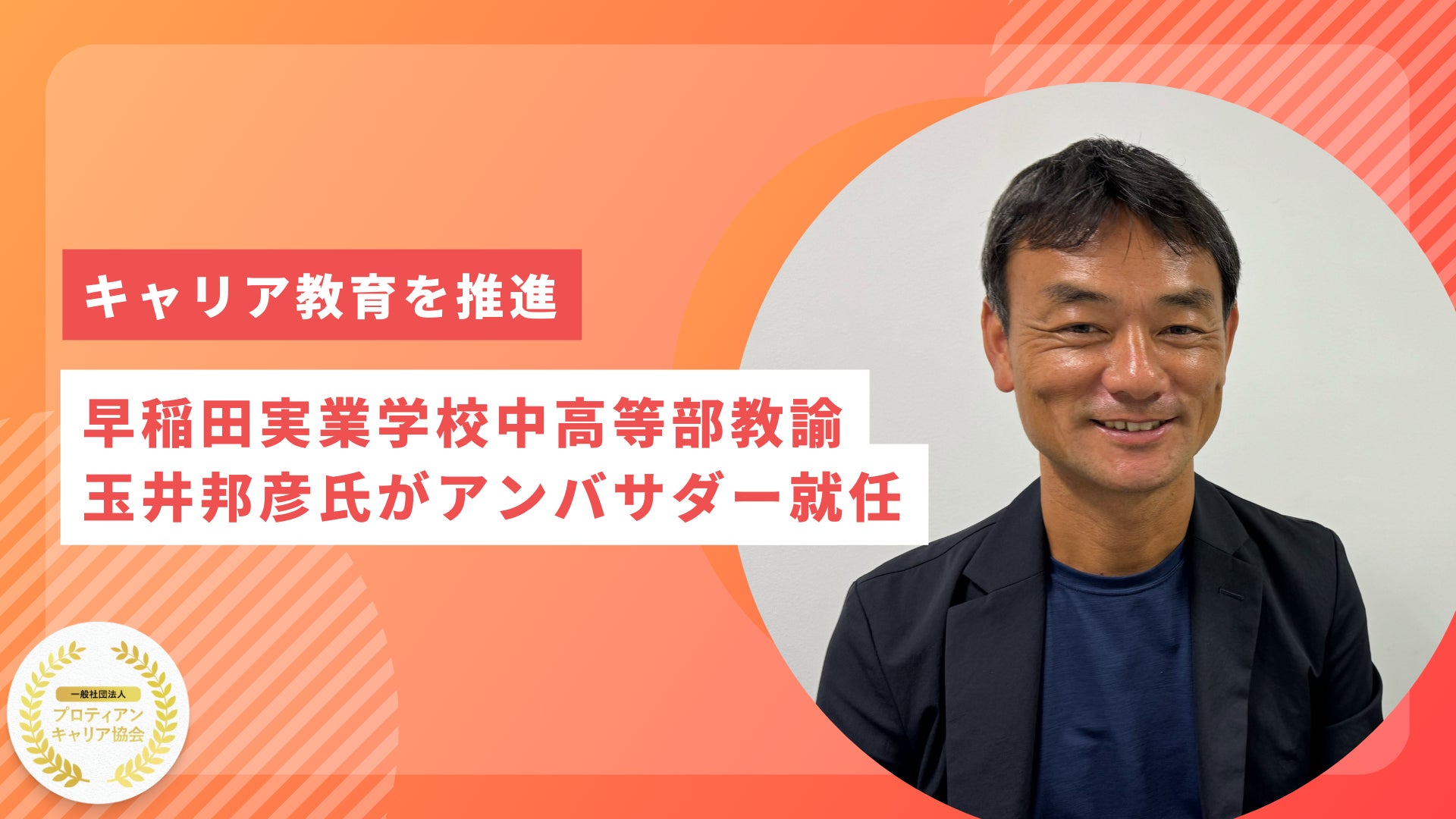 一般社団法人プロティアン・キャリア協会(東京都新宿区、代表理事:田中研之輔・有山徹、以下「当協会」)は、組織と個人のより良い関係構築と個人の主体的なキャリア開発を支援する団体です。このたび、早稲田実業学校中高等部教諭の玉井邦彦氏をプロティアン・キャリア協会アンバサダーに迎えることをお知らせいたします。今後も当協会では子ども達の未来のためにプロティアン・キャリア教育をより多くの教育現場に広めてまいります。
