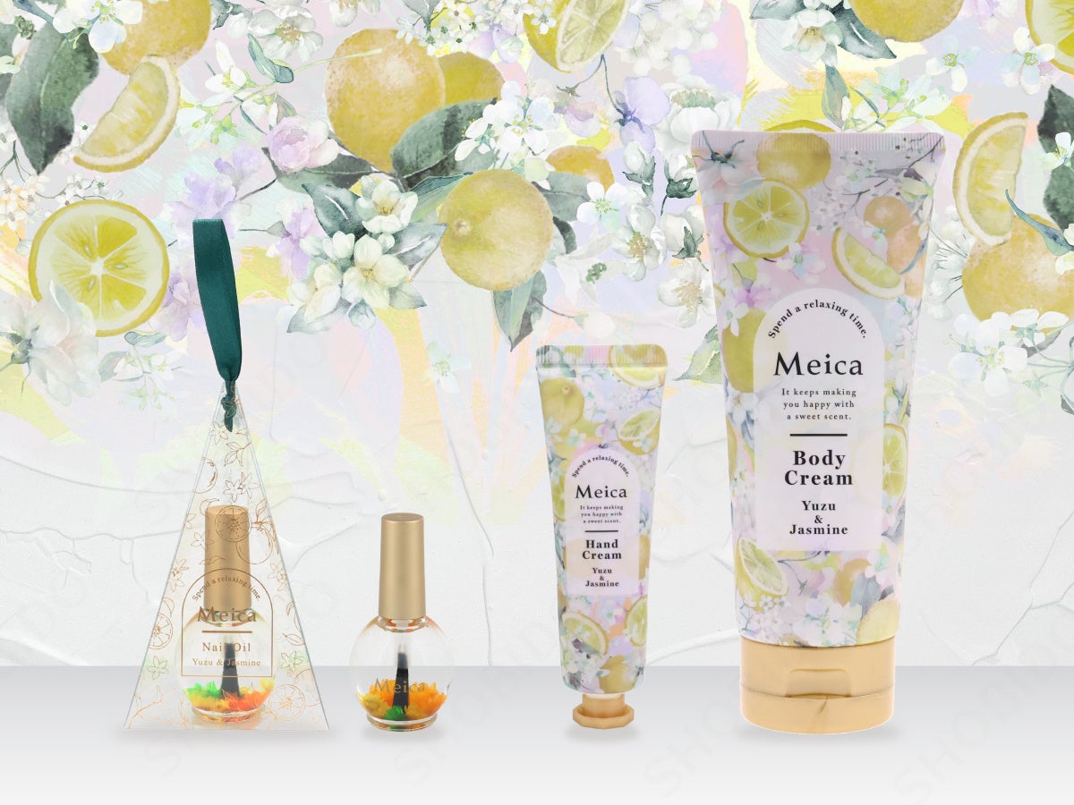 ジリジリと照りつけるような暑さが落ち着き、季節の移り変わりを感じるとともに、お肌の荒れや乾燥が気になり始めるこの季節。新商品「Meica」ゆずジャスミンシリーズは、ネイルオイル、ハンドクリーム、ボディクリームの3アイテムを展開。「幸福」「優美」などの花言葉をもち、香り高いジャスミンは、大切な人へのギフトにもぴったり。ぜひお手にとってお楽しみください。