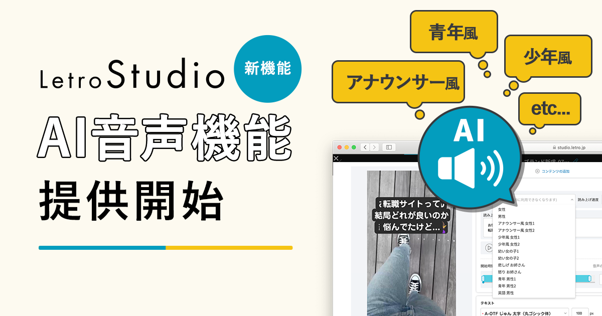 LetroStudio、新機能「AI音声機能」を提供開始。縦型動画の制作ニーズの高まりに合わせ、多数の音声データ搭載