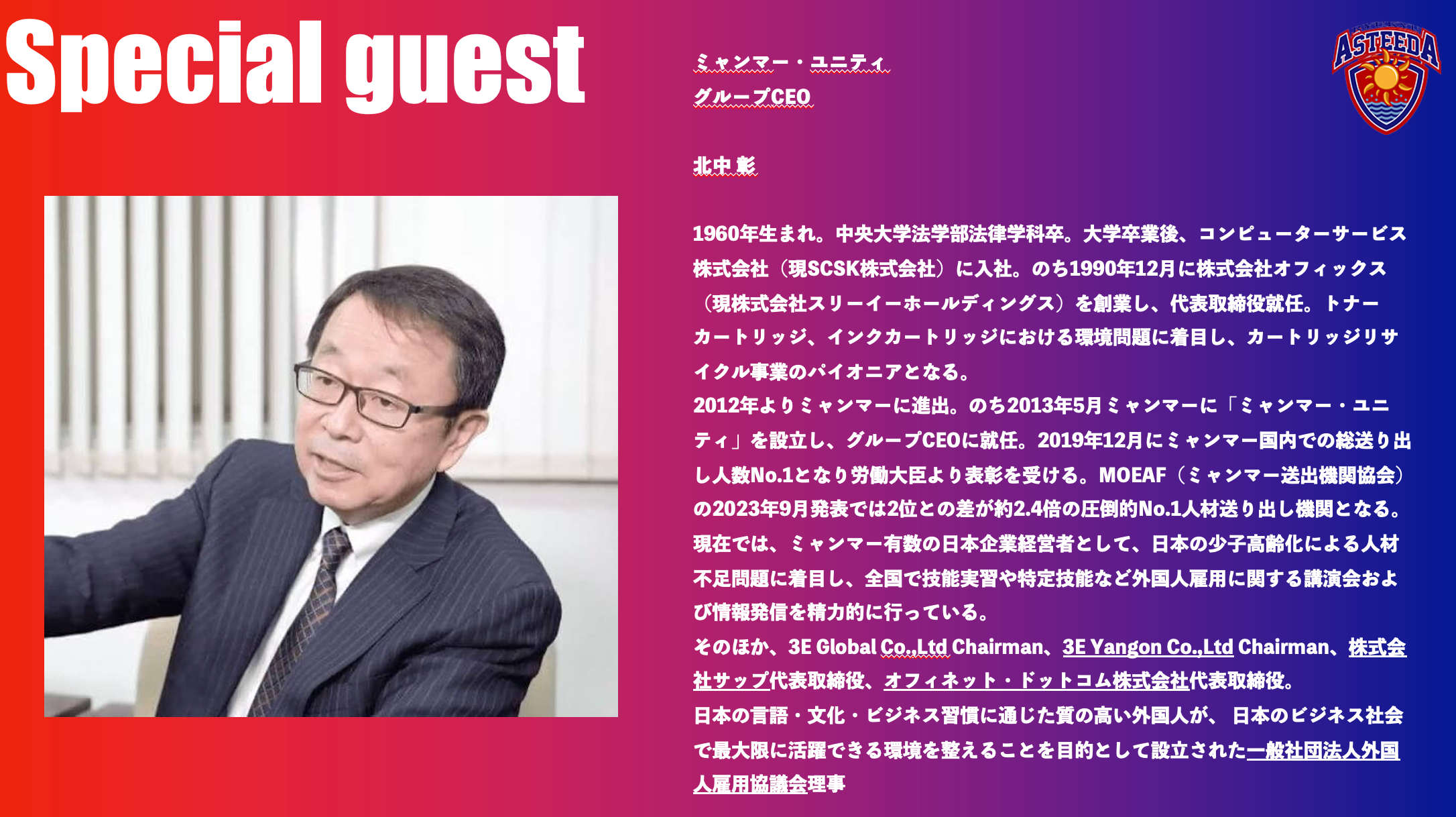 【登壇決定】ミャンマー・ユニティ グループCEO北中が、経営者1000人が集うアスティーダフェスティバルに登壇。セッションテーマ『日本の人手不足とミャンマー人材の可能性:新たなビジネスチャンスを探る』