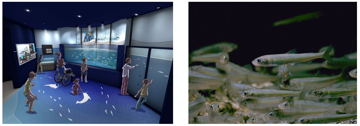 新しい水槽では、琵琶湖の伝統漁法「エリ」で使用されるエリツボで、コアユが群れとなって泳ぐ姿を再現する予定です。