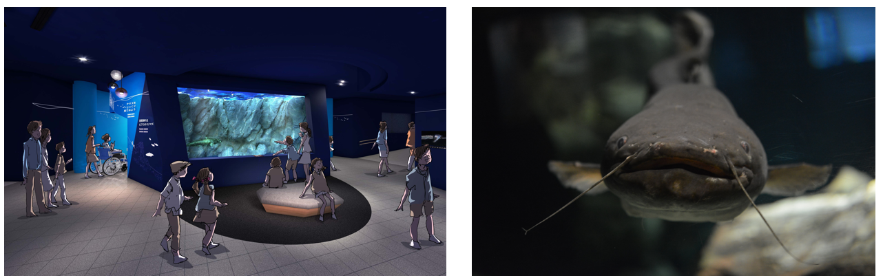 このような琵琶湖に生息する3種のナマズが湖岸に集う様を、これまでにはなかった形で、新しい水槽で表現したいと考えています。