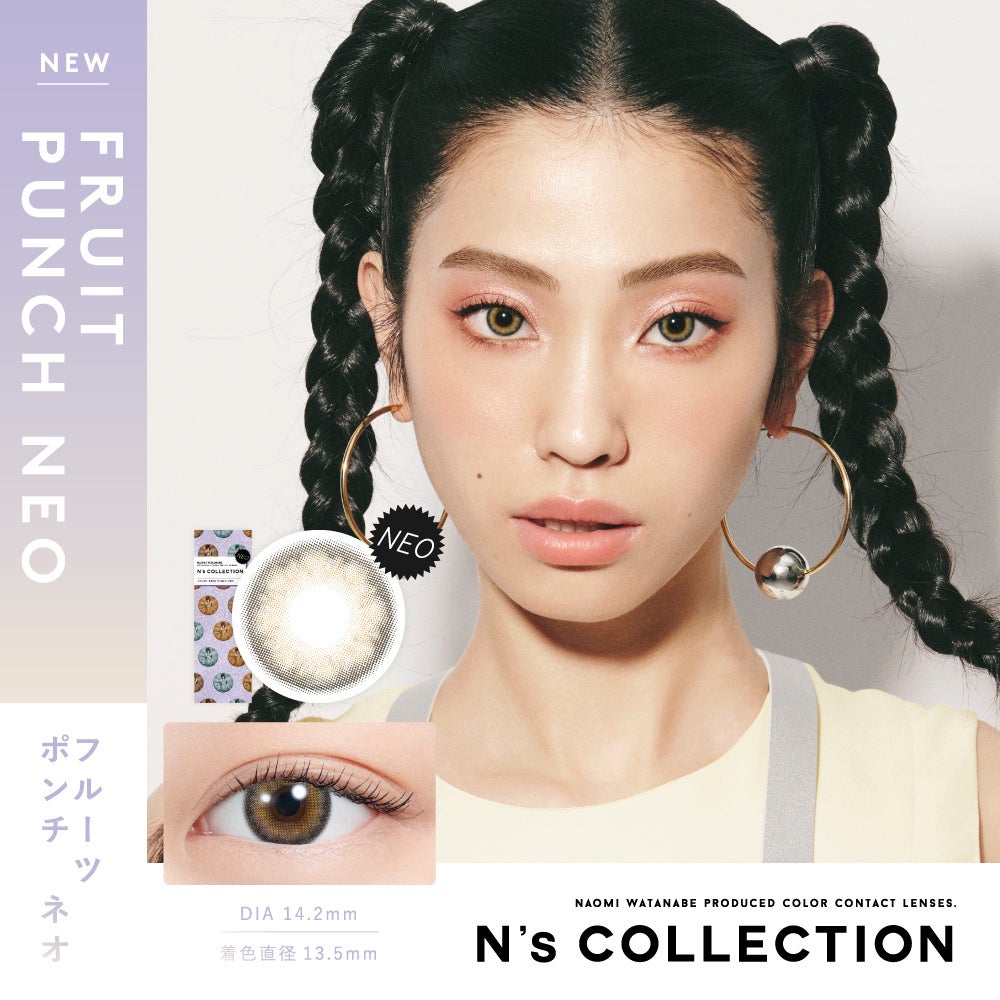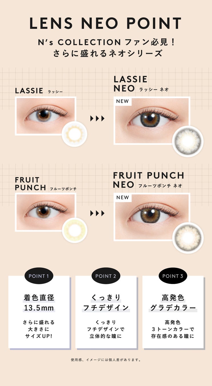『N’s COLLECTION』待望の新色は、人気カラー「LASSIE(ラッシー)」「FRUIT PUNCH(フルーツポンチ)」が、さらに可愛く“NEO”になって新登場。『N’s COLLECTION』ならではの発色の良さはそのままに、着色直径を大きく、フチデザインを施すことでさらに盛れる仕上がりになっております。「LASSIE NEO(ラッシー ネオ)」「FRUIT PUNCH NEO (フルーツポンチ ネオ)」、どちらも『N’s COLLECTION』ファン必見のカラーラインナップです。