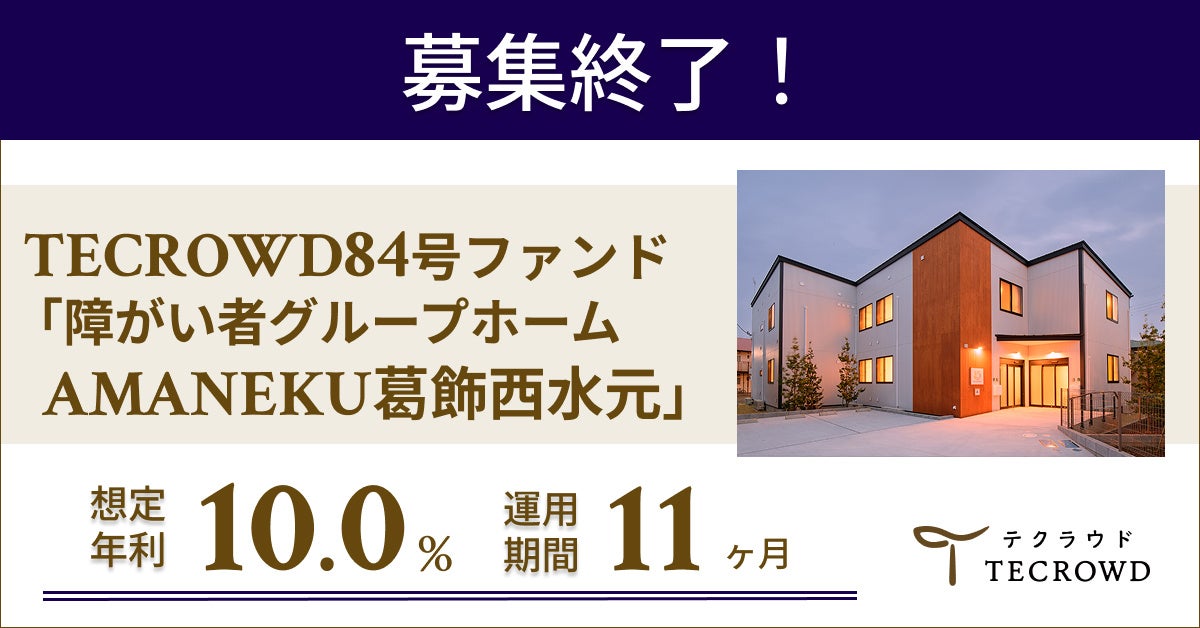 【想定年利10.0%】国内キャピタルゲイン型ファンド「障がい者グループホーム AMANEKU葛飾西水元」に投資するTECROWD84号ファンドの募集終了