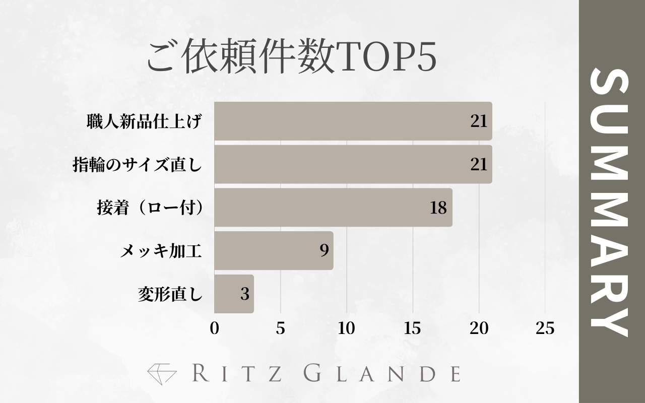 北海道札幌市のジュエリー修理・リフォーム専門店のRITZ GLANDEは、2026年1月にご依頼いただいた内容を集計いたしましたので上位5位までをランキング別にご紹介します。