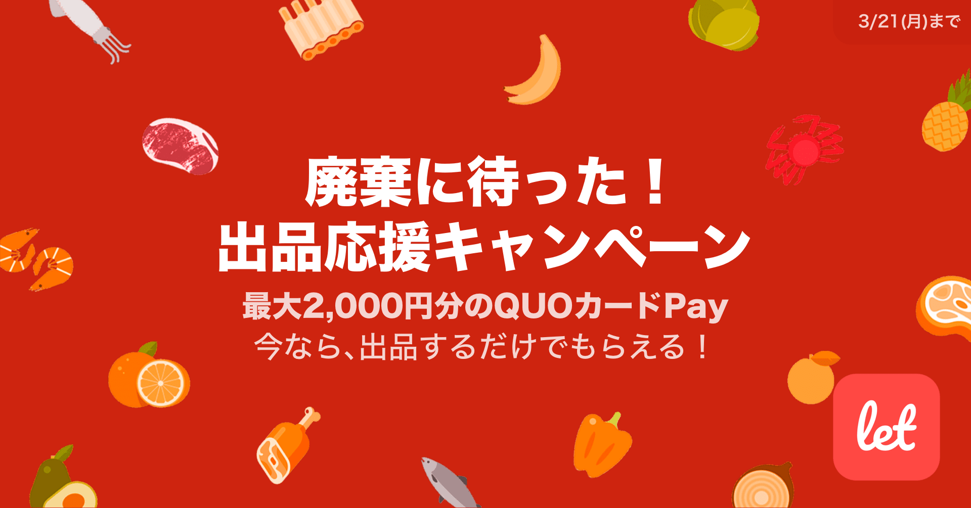 株式会社レット(本社:東京都港区、代表:佐藤 航陽)が運営する、食品ロス/在庫ロス削減のマーケット「Let(レット)」内で「廃棄に待った! 出品応援キャンペーン」を3月15日(火) 正午より開催します。はじめて「食品」を出品した方を対象に最大2,000円分のQUOカードPayをプレゼントいたします。レットでは最短1分で簡単に商品の販売が可能ですので、ご自身で生産されているお野菜や果物などの販売にこの機会を是非ご利用ください。
