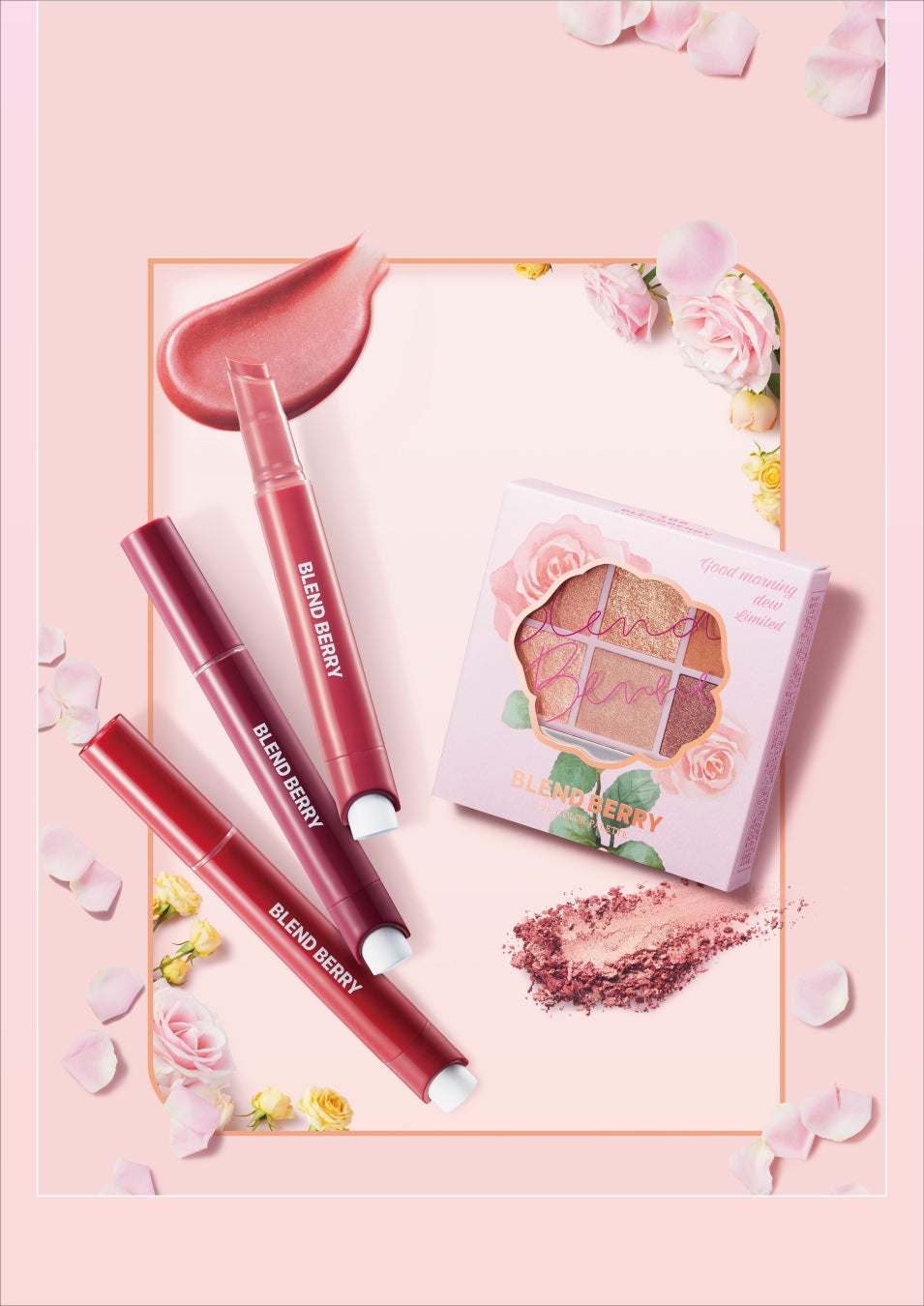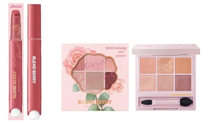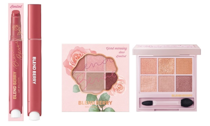 『BLEND BERRY』は、“可愛い”の完璧主義者、「ナルシスティックビューティ」をコンセプトとし、ベリーの鮮やかなカラーと繊細なテクスチャーからインスパイアされたメイクブランドです。2024年春夏のカラーコンセプト「Good(グッド) morning(モーニング) dew(デュー)~朝露に濡れ、光を震わす みずみずしい薔薇の花~」を掲げ、くすんだローズピンクやベビーピンクをメインカラーとして採用しました。柔らかな色合いのローズブラウンな目もとと、透明感を引き出す湿度感のある唇を叶えるコレクションです。リップカラーとアイシャドウをラインナップしました。