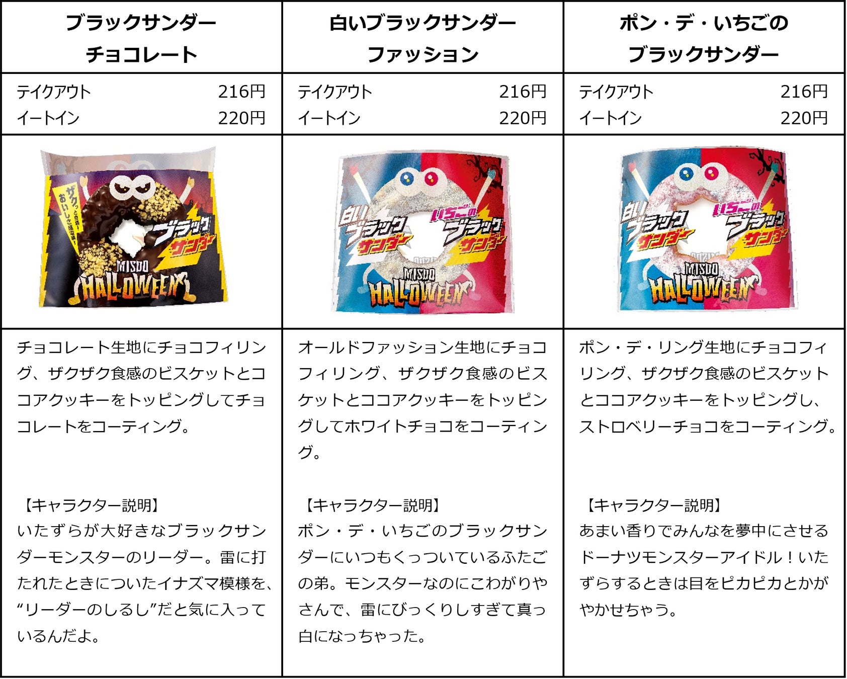 ザクザク食感のビスケットとココアクッキーをトッピングしてチョコレートをコーティング、仕上げのゴールデントッピングをイナズマに見立て、「ブラックサンダー」を表現した「ブラックサンダーチョコレート」など、圧倒的ザクザク感が特長の「ブラックサンダー」を人気のドーナツで表現しました。その他にも「白いブラックサンダーファッション」や「ポン・デ・いちごのブラックサンダー」など、ハロウィーンを楽しめるラインアップです。