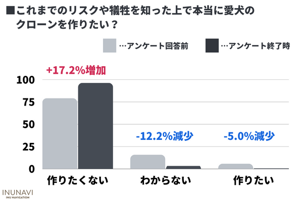 - 様々なリスク・犠牲を知って愛犬のクローンを「作りたくない」飼い主さんは96.1%と初回質問から17.2%増