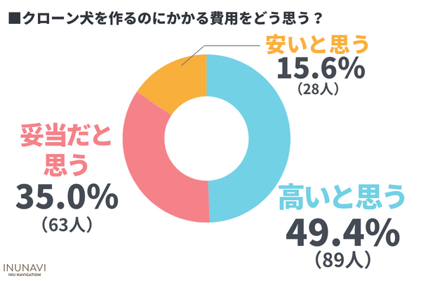 ・クローン犬を作る費用を「高いと思う」と回答した飼い主は49.4%と最多だが、「妥当だと思う」「安いと思う」飼い主のほうが5割強と上回る結果となった。