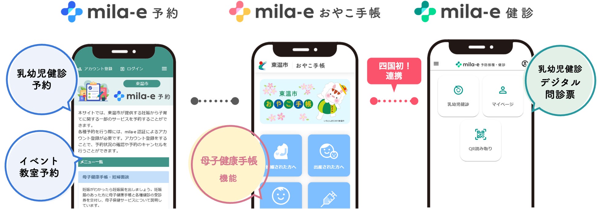 また、母子手帳アプリ「mila-eおやこ手帳」と乳幼児健診デジタル問診票サービス「mila-e 健診」の連携は四国地方初の事例で、子育て家庭の方々により簡便にサービスをご利用いただけるよう東温市職員の方々と協力して提供してまいります。