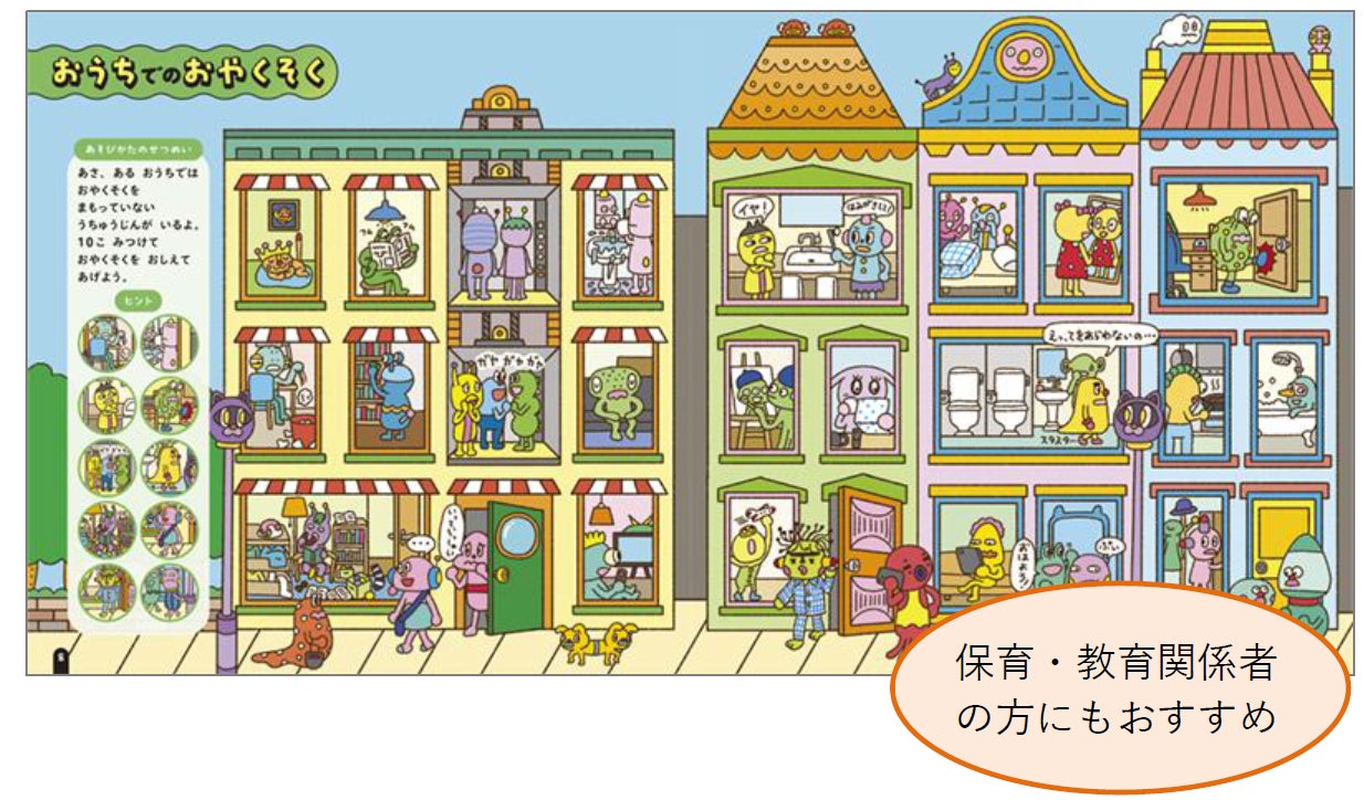 細かく楽しいイラストに目を凝らし、「おやくそく」を守っていない宇宙人を探して、何がマナー・ルール違反なのか親子で一緒に考えてみるのもおすすめです。
