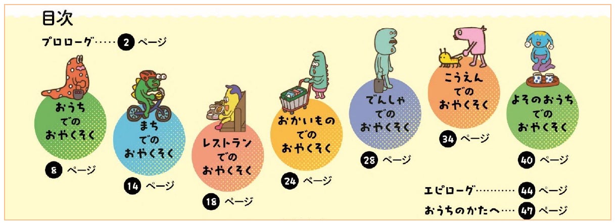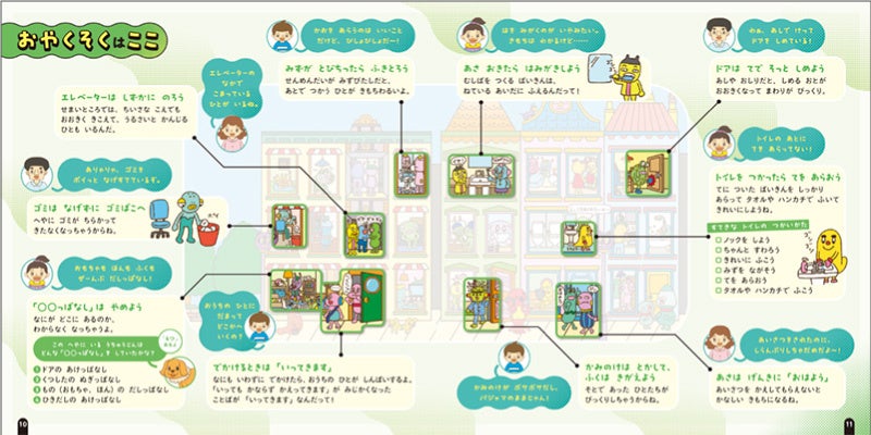 本書はストーリーページ・絵さがしページ・解説ページで構成され、朝の「おはよう」から、トイレの使い方、電車の乗り方まで、あいさつ・食事のマナー・交通ルール・礼儀など70の「おやくそく」を子ども自身が考え、遊びながら覚えることができます。