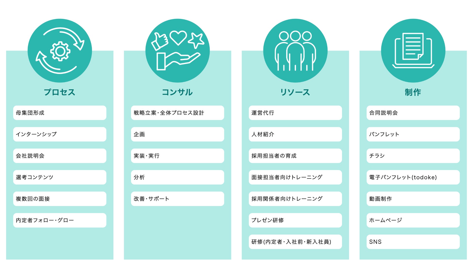 当社では、単なるノウハウやツールの提供を行っているのではなく、企業様の採用成功をゴールとし支援を行っております。ツールやコンテンツを導入するだけでは、採用課題の根本的な解決にはなりません。それらを活かし、安定的な採用活動ができるようになることが最も重要となります。企業様が自走できるようになるまで伴走し、採用を成功に導く支援を行なっています。