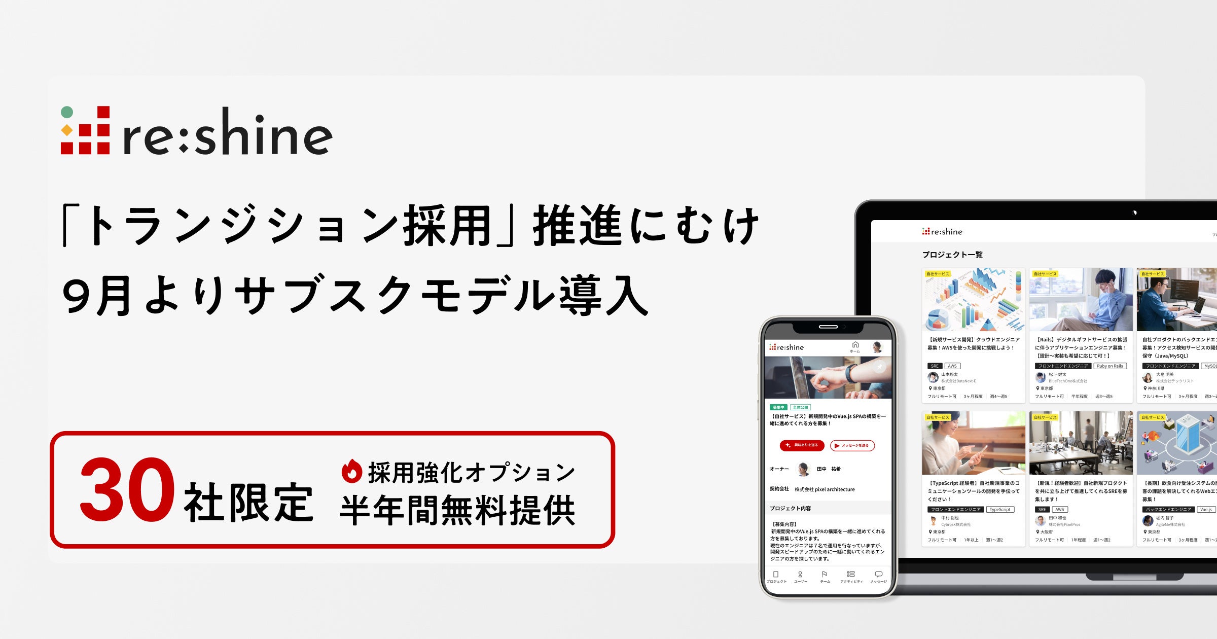 メタップスホールディングス(渋谷区、代表取締役社長 山﨑祐一郎)が提供するフリーランスと企業のマッチングサービス「re:shine(リシャイン)」は、2024年9月2日(月)より、企業側に月額基本料が発生するサブスクリプション型プランを新たに提供開始します。これにより得た収益は、優秀なフリーランス人材を安定的に確保するための広告費として活用し、フリーランスを社員として採用する「トランジション採用」をさらに推進します。また、社員の採用に苦戦するスタートアップ企業を支援するため、有料の採用強化オプションを30社限定で半年間無料提供するキャンペーンを実施し、本日から申し込み受付を開始します。