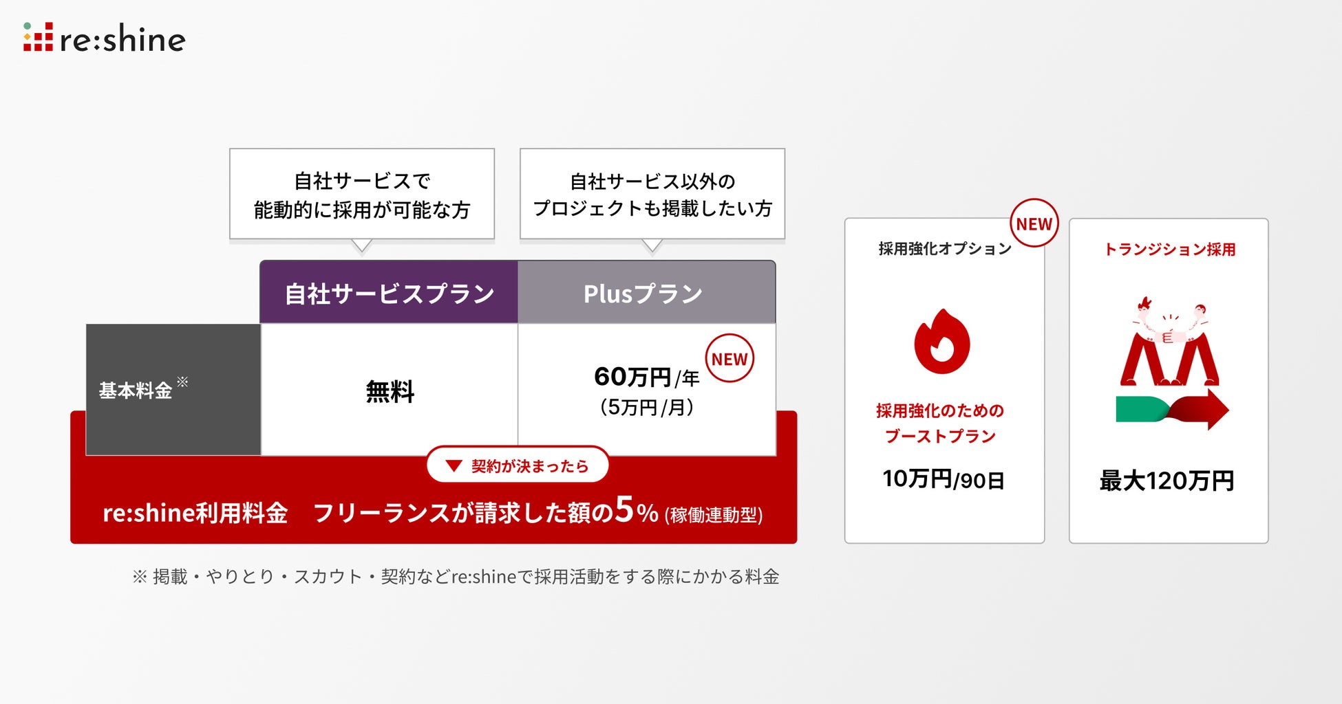 「re:shine」は2019年に提供を開始し、フリーランスは完全無料、企業はフリーランスの稼働に連動して5%の利用料がかかるビジネスモデルで運営してきました。約5年を経た今、フリーランスの新規登録や案件を掲載する企業との契約数も順調に増加しています。また、今年7月に「有料職業紹介事業」の許可を取得したことに伴い、フリーランスを正社員として採用する「トランジション採用」も可能になりました。(※)
