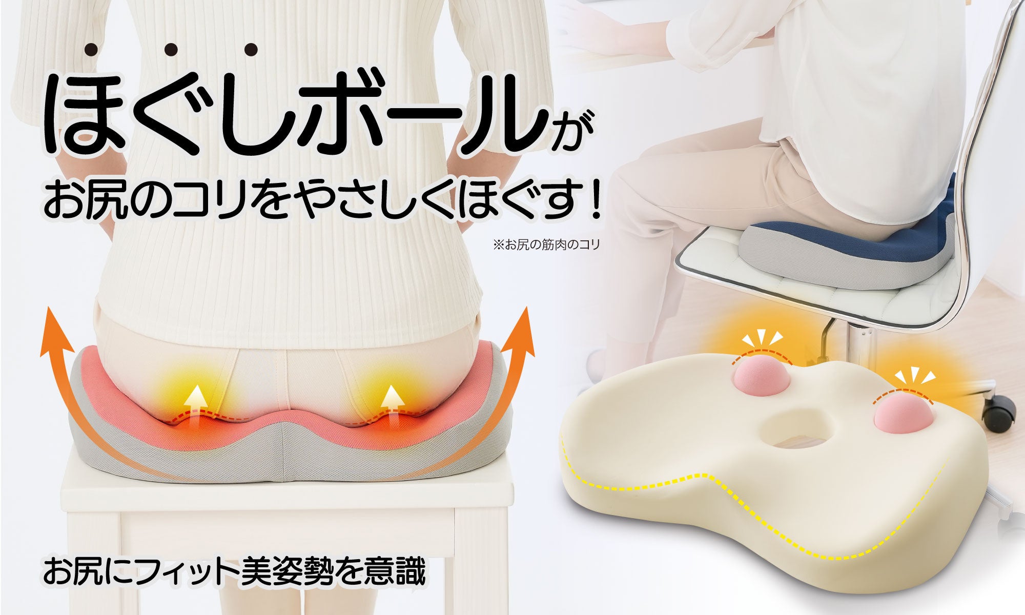 カチコチお尻対策!2つの指圧ボールがお尻の筋肉のコリをほぐし、美姿勢をサポートするクッション
